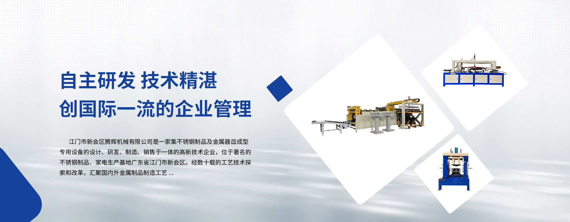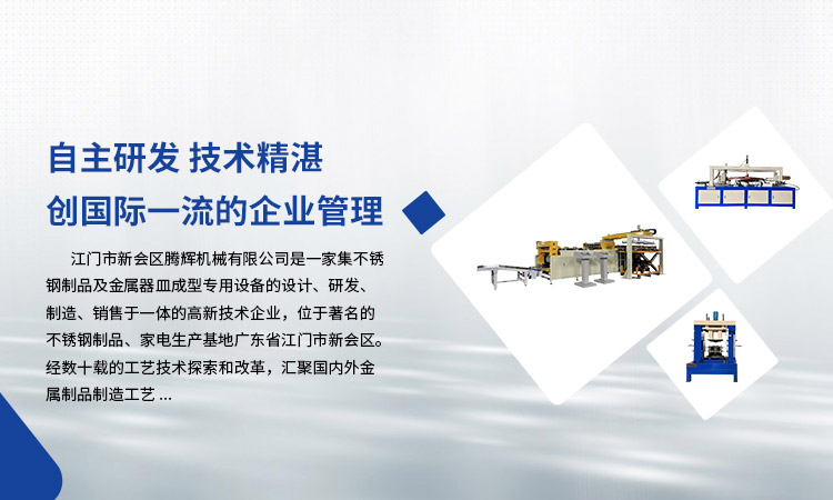 江門市新會區(qū)騰輝機械有限公司是一家集不銹鋼制品及金屬器皿成型專用設備的設計、研發(fā)、制造、銷售于一體的高新技術企業(yè),位于著名的不銹鋼制品、家電生產基地廣東省江門市新會區(qū)。經數十載的工藝技術探索和改革,匯聚國內外金屬制品制造工藝。